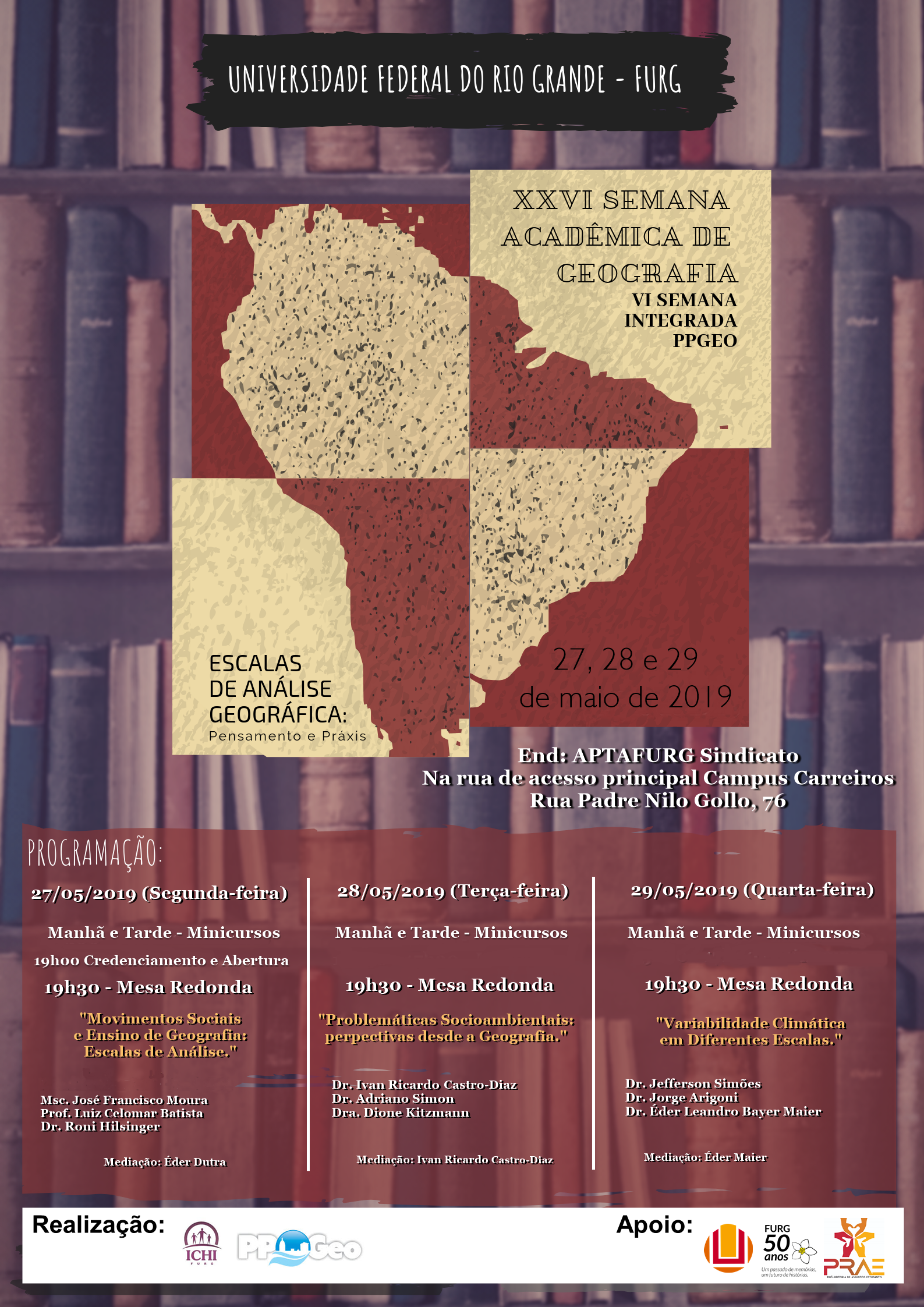 A XXVI Semana Acadêmica de Geografia e VI Semana Integrada PPGeo acontecerá nos dias 27,28 e 29 de Maio no auditório da APTAFURG (entrada no campus Carreiros) - Avenida Padre Nilo Gollo, número 76. Além do site os interessados poderão se inscrever no dia do evento. Confira abaixo os minicursos que serão ofertados nos turnos da manhã e da tarde durante os 3 dias e também a programação no turno da noite. Para mais informações entre em contato através do endereço de e-mail: semanaintegrada2019@gmail.com