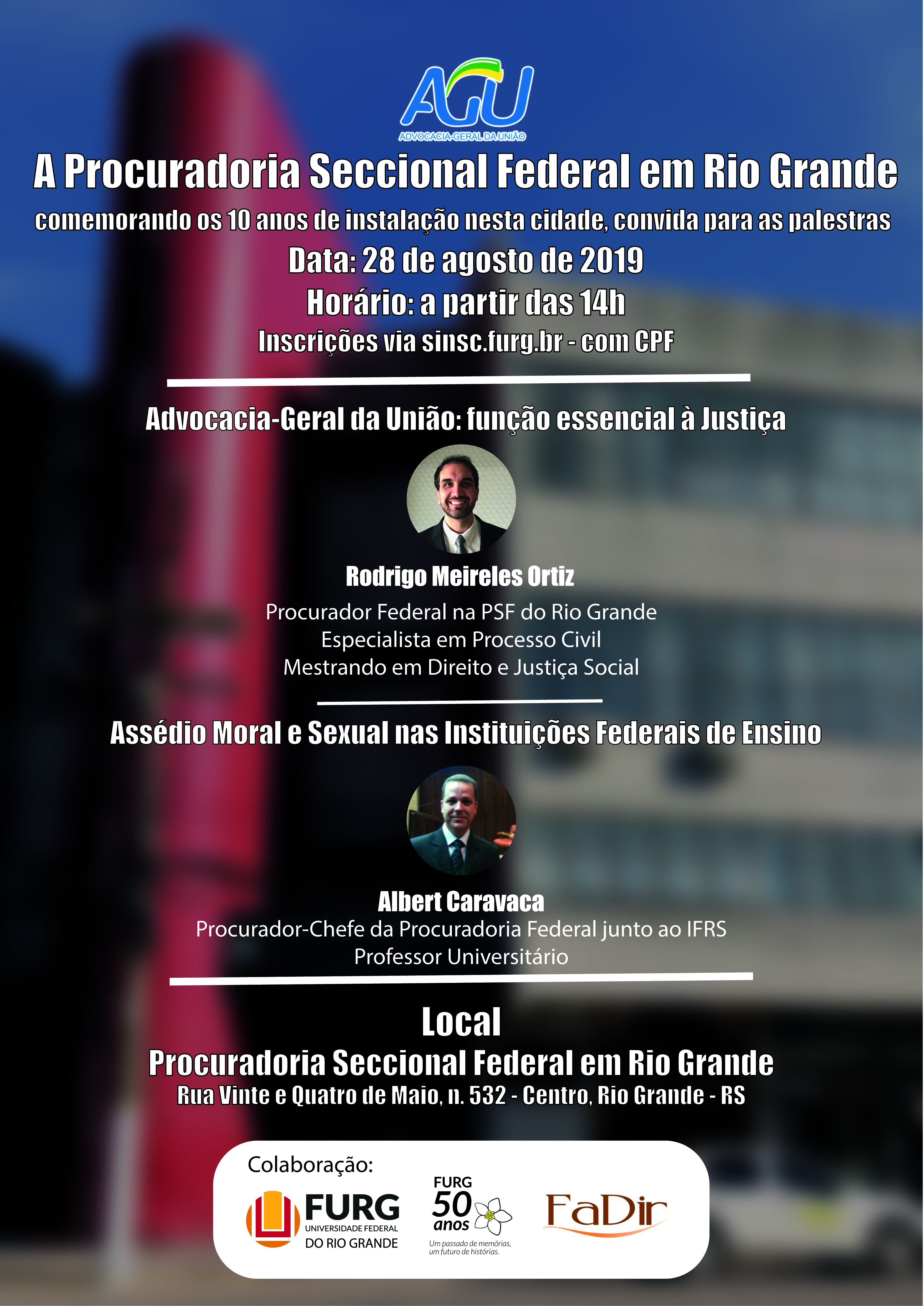 10 anos da Procuradoria Seccional Federal em Rio GrandeA Procuradoria Seccional Federal em Rio Grande comemorando 10 anos de instalação da sede nesta cidade, convida para as palestras com os Procuradores Federais Rodrigo Meireles Ortiz e Albert Caravaca. O evento conta com a colaboração da Faculdade de Direito da Universidade Federal do Rio Grande. Data: 28 de agosto de 2019 Local: Procuradoria Seccional Federal em Rio Grande (R. Vinte e Quatro de Maio, nº 532 - Centro, Rio Grande) Horário: a partir das 14h