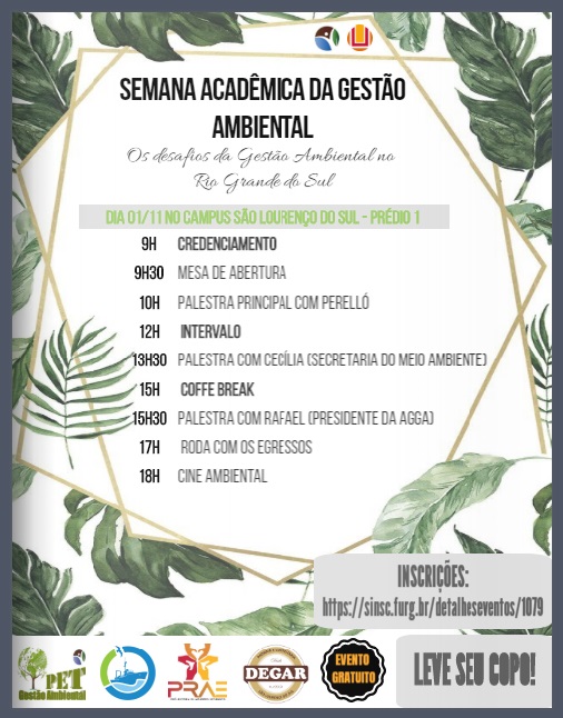 A Semana Acadêmica da Gestão Ambiental (SAGA) tem como objetivo discutir os desafios da Gestão Ambiental no estado do Rio Grande do Sul. O evento será realizado no dia 1° de novembro no Campus da FURG em São Lourenço do Sul/RS.