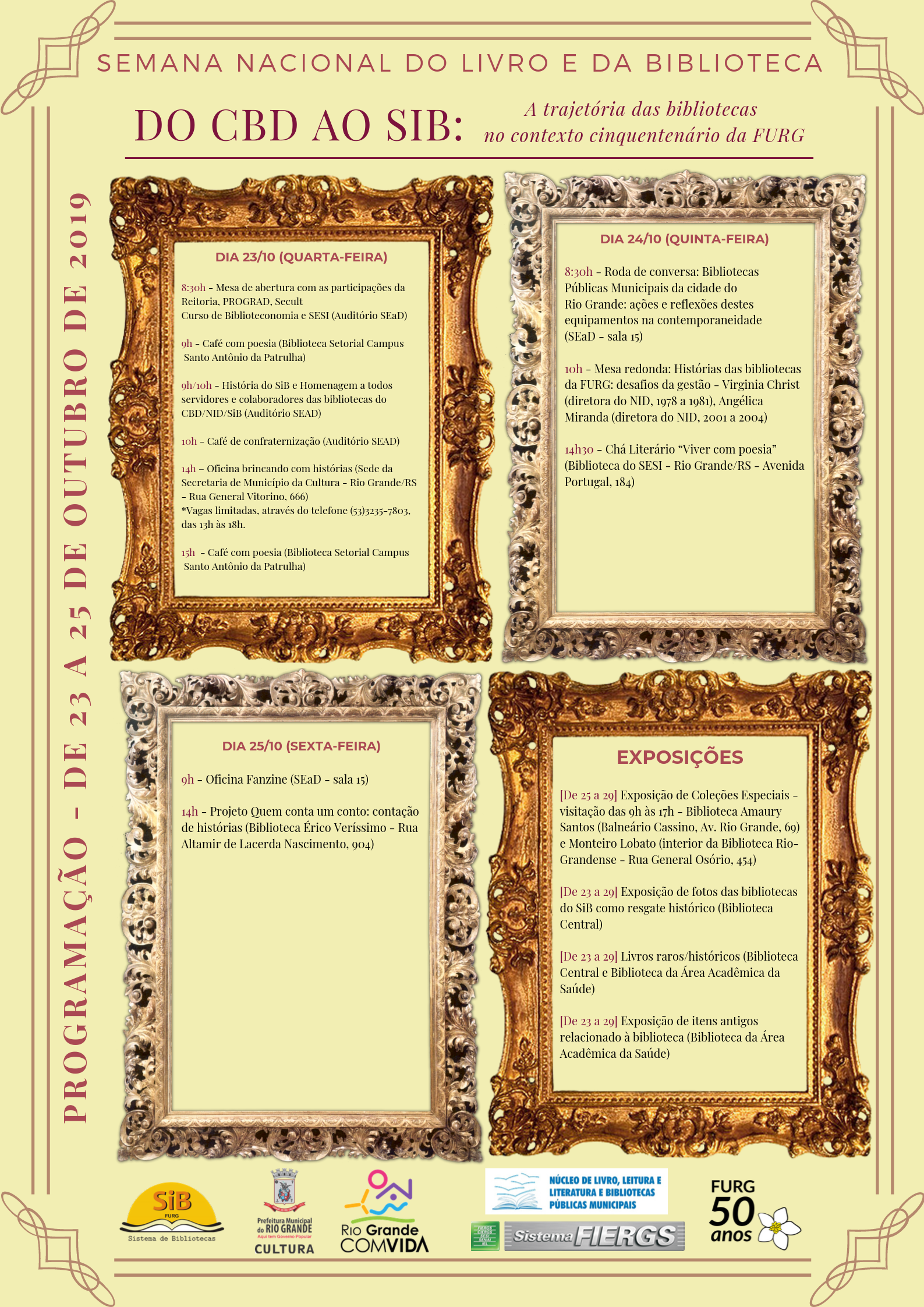 Semana Nacional do Livro e da Biblioteca 2019SEMANA NACIONAL DO LIVRO DE DA BIBLIOTECA 2019 - SiB FURG Do CBD ao SiB: a trajetória das bibliotecas, no contexto do cinquentenário da FURG Período: de 23 a 29 de outubro