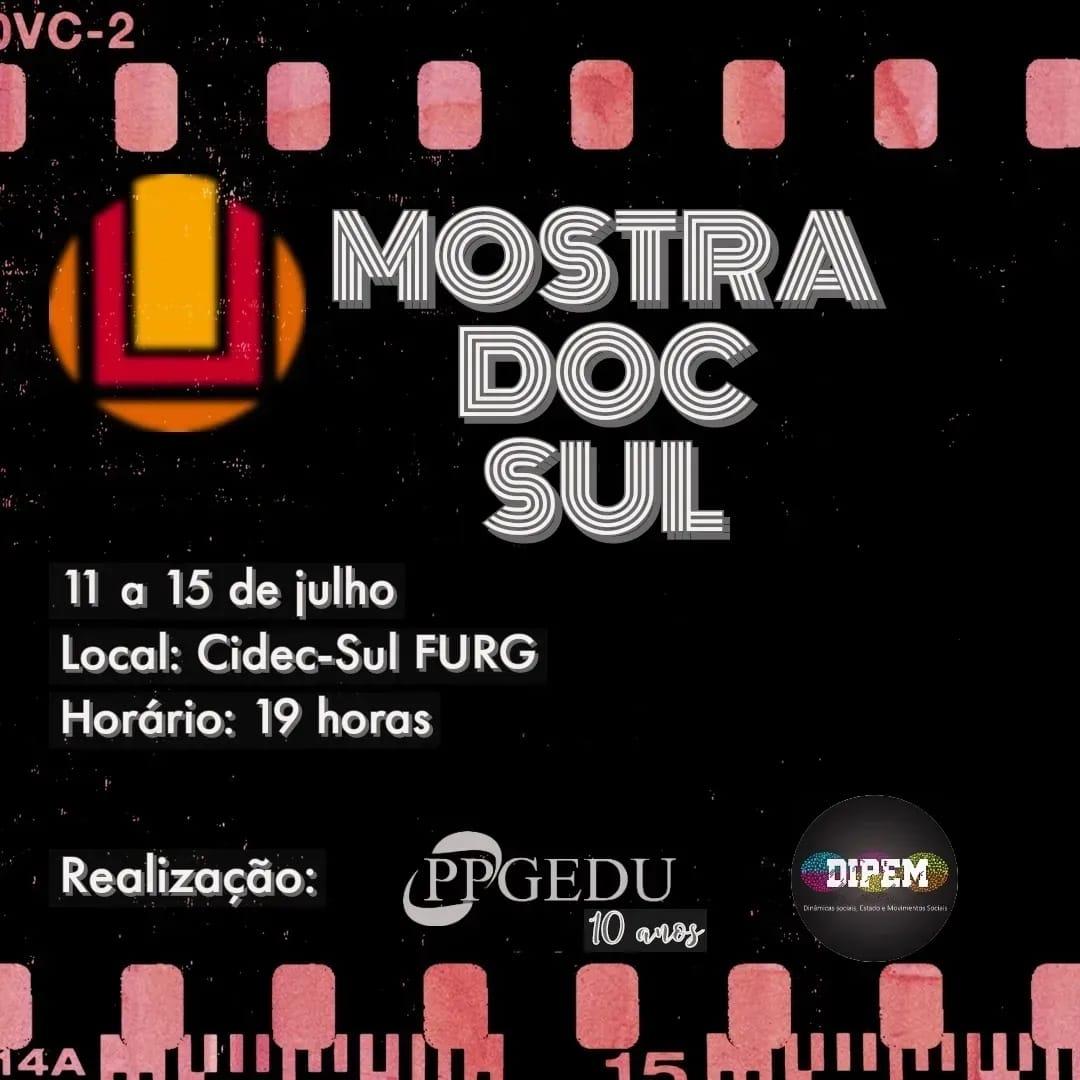 Mostra DocSulO Mostra DocSul é um espaço para exibição de documentários que tratem de temas sociais, culturais e políticos pertinentes para o atual período no país. A mostra trará, além da direção e produção dos filmes, especialistas que debaterão as temáticas apresentadas. Esta é uma das atividades realizadas em comemoração aos 10 anos do Programa de Pós-Graduação em Educação da FURG.