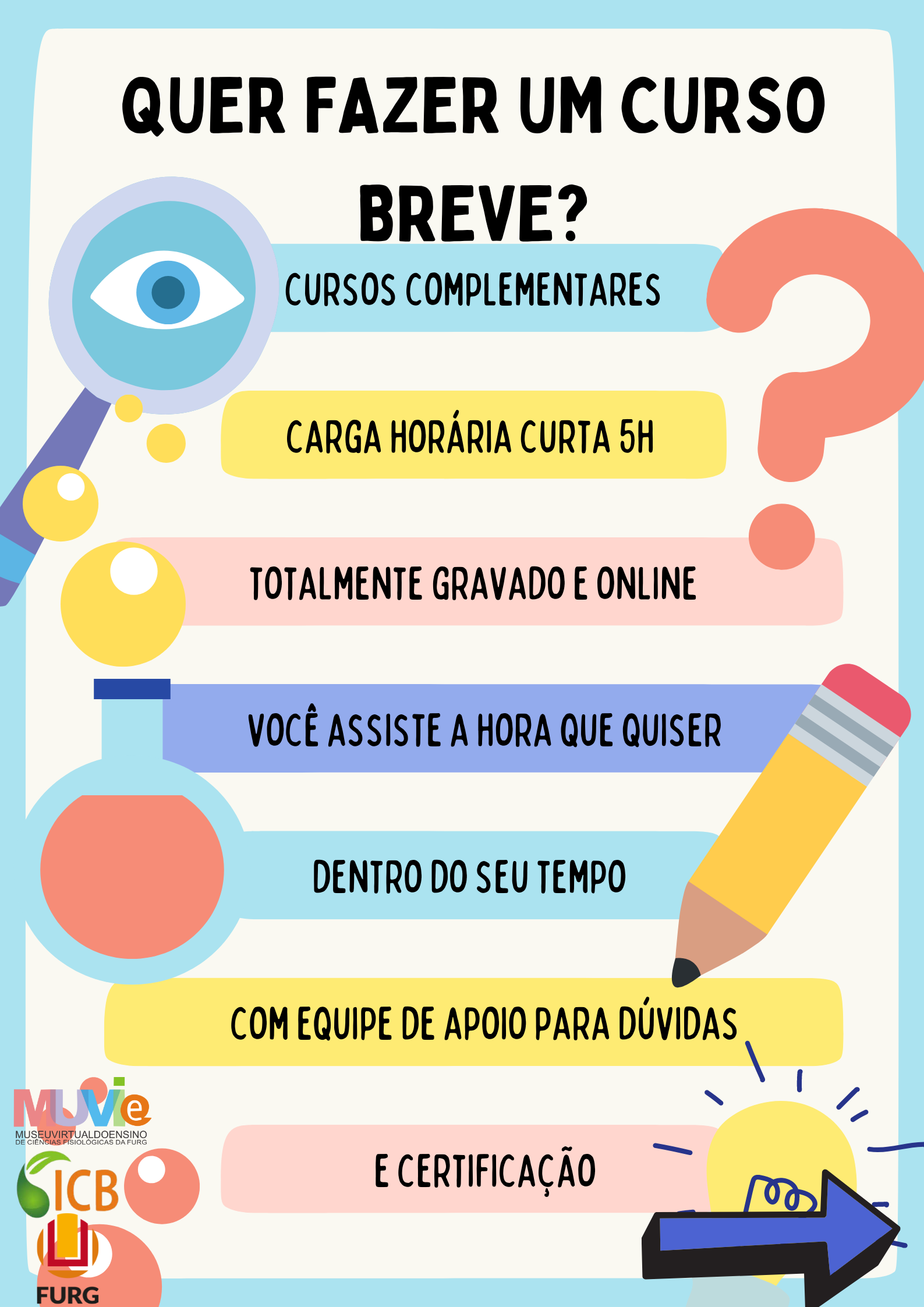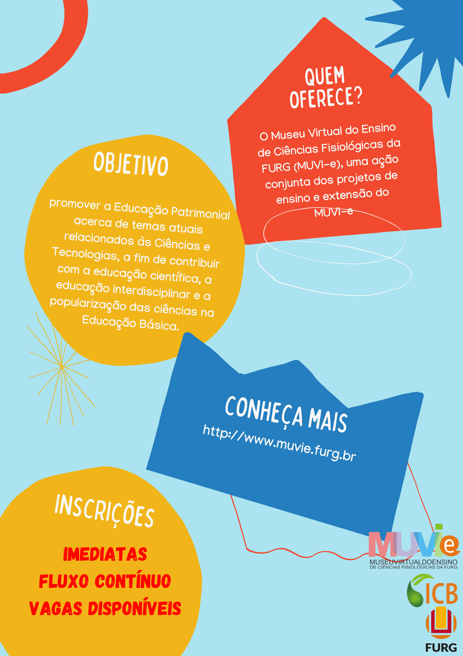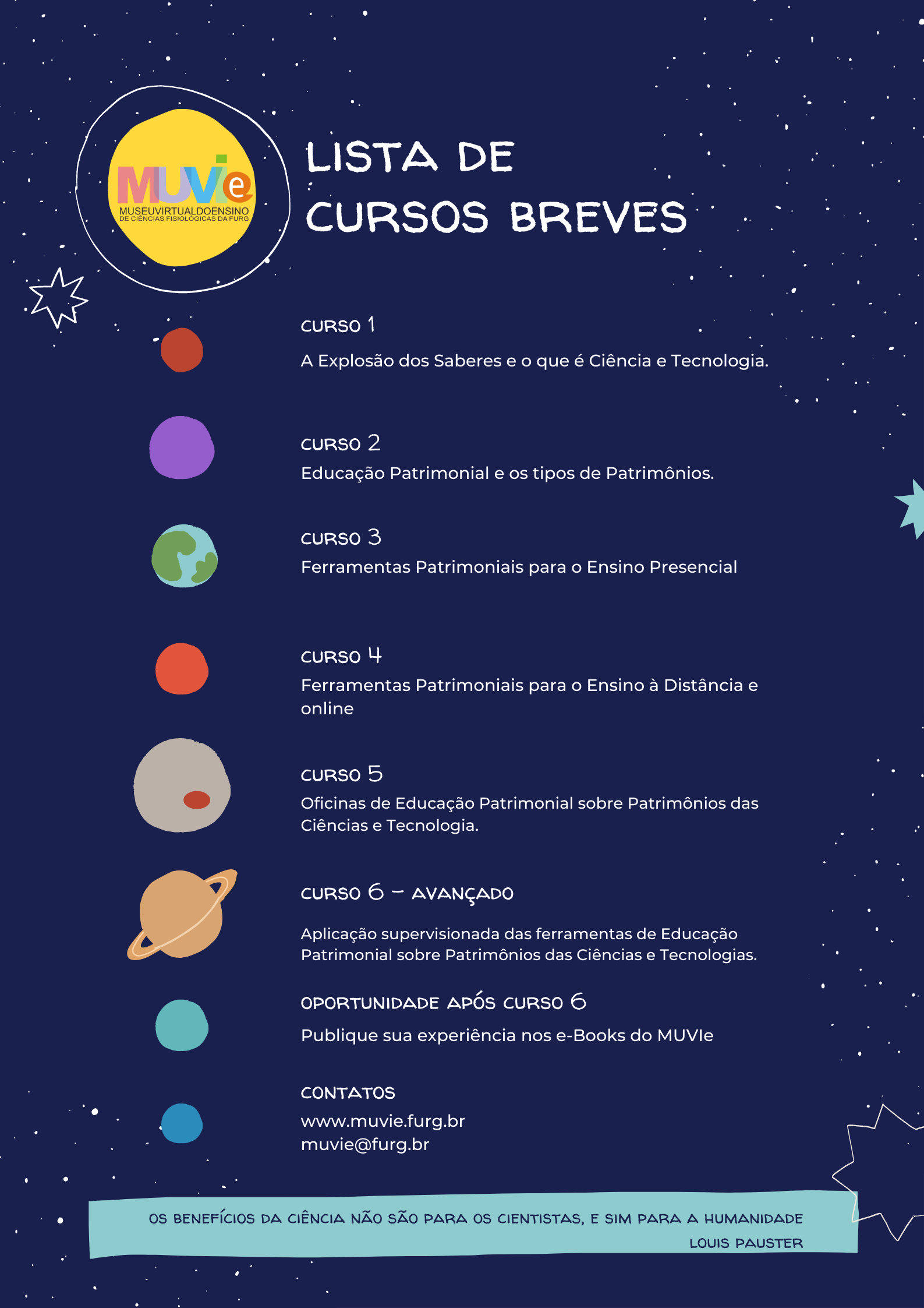 CURSOS BREVES SOBRE PATRIMÔNIOS DE CIÊNCIA E TECNOLOGIAO que são? Os cursos breves tratam sobre a temática “Educação Patrimonial, Ciência e Tecnologia”. Objetivo dos cursos é promover a Educação Patrimonial acerca de temas atuais relacionados às Ciências e Tecnologias, a fim de contribuir com a educação científica, a educação interdisciplinar e a popularização das ciências na Educação Básica. Portanto, abordaremos os conceitos, teorias e a aplicação das ferramentas patrimoniais digitais/virtuais e presenciais. Os cursos são gravados e serão ofertados diretamente no site do https://www.muvie.furg.br/ . Os cursos breves estão divididos inicialmente em seis temáticas, com uma carga horária de 05 horas cada, podendo ser realizados fora da ordem, e, não necessariamente, é obrigatório realizar todos os cursos. Para cada curso será emitida certificação de 5 horas. E Para quem são esses cursos? Estudantes de Licenciaturas, professores, servidores e comunidade em geral. Quem está oferecendo? É a equipe do projeto Museu Virtual do ensino de ciências fisiológicas da FURG, através de uma ação conjunta dos seus projetos de ensino e extensão. Certificação? Os certificados serão expedidos pela Pró-reitoria de Extensão e Cultura da Universidade Federal do Rio Grande- FURG (participantes externos à FURG) ou pela Pró-Reitoria de Graduação (no caso do participante ser aluno ou servidor da FURG), e enviados para os respectivos e-mails cadastrados no ato da inscrição, no prazo de 30 a 60 dias a contar da conclusão do curso, ou conforme a demanda de produção de certificados das Pró-reitorias. Onde me inscrevo? Inscrições estarão abertas até 31 de março de 2023, pelo endereço eletrônico https://sinsc.furg.br . Não há limite de vagas. Dúvidas e demais informações, entre em contato com muvie@furg.br