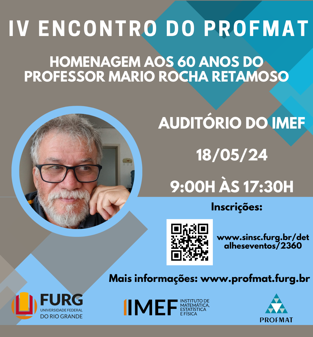 Este Encontro visa contribuir com a formação e a capacitação do professor de Matemática do Ensino Básico, promover debates e apresentar propostas e pesquisas relacionadas à Matemática e seu ensino. Além disso, o Encontro será uma edição especial em homenagem aos sessenta anos do professor Dr. Mario Rocha Retamoso, docente do PROFMAT.
