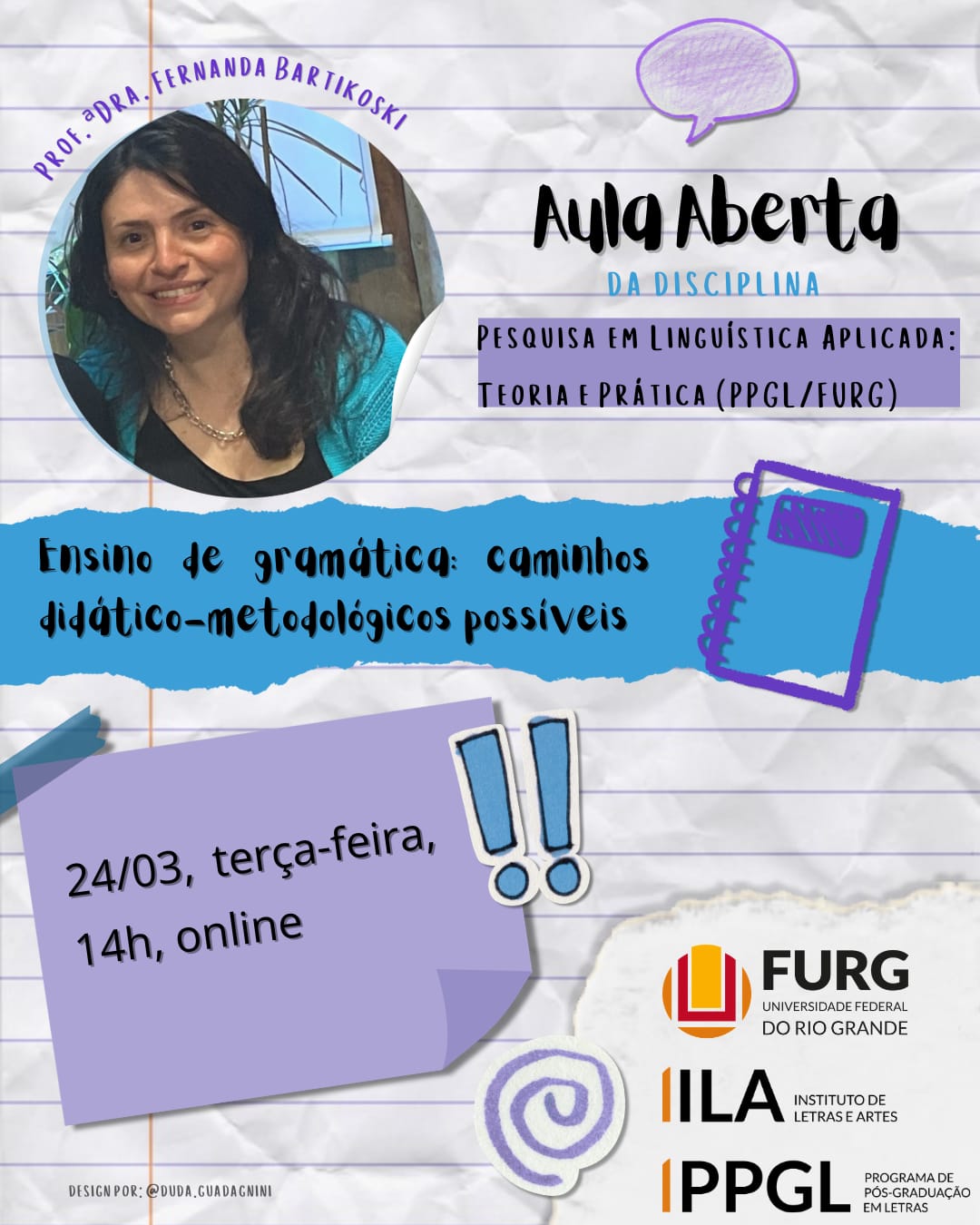 Aula Aberta - Ensino de gramática: caminhos didático-metodológicos possíveisOlá, pessoal. Tudo bem? A turma de Pesquisa em Linguística Aplicada: Teoria e Prática, do Programa de Pós-Graduação em Letras (PPGL/FURG), convida a todos/as para a Aula Aberta intitulada Ensino de gramática: caminhos didático-metodológicos possíveis. Convidada: Prof.ª Dra. Fernanda Bartikoski, Doutora em Linguística Aplicada (Unisinos) e docente de Língua Portuguesa, Redação e Literatura no Ensino Fundamental e Médio. O encontro será no dia 24/03, terça-feira, às 14h, online.