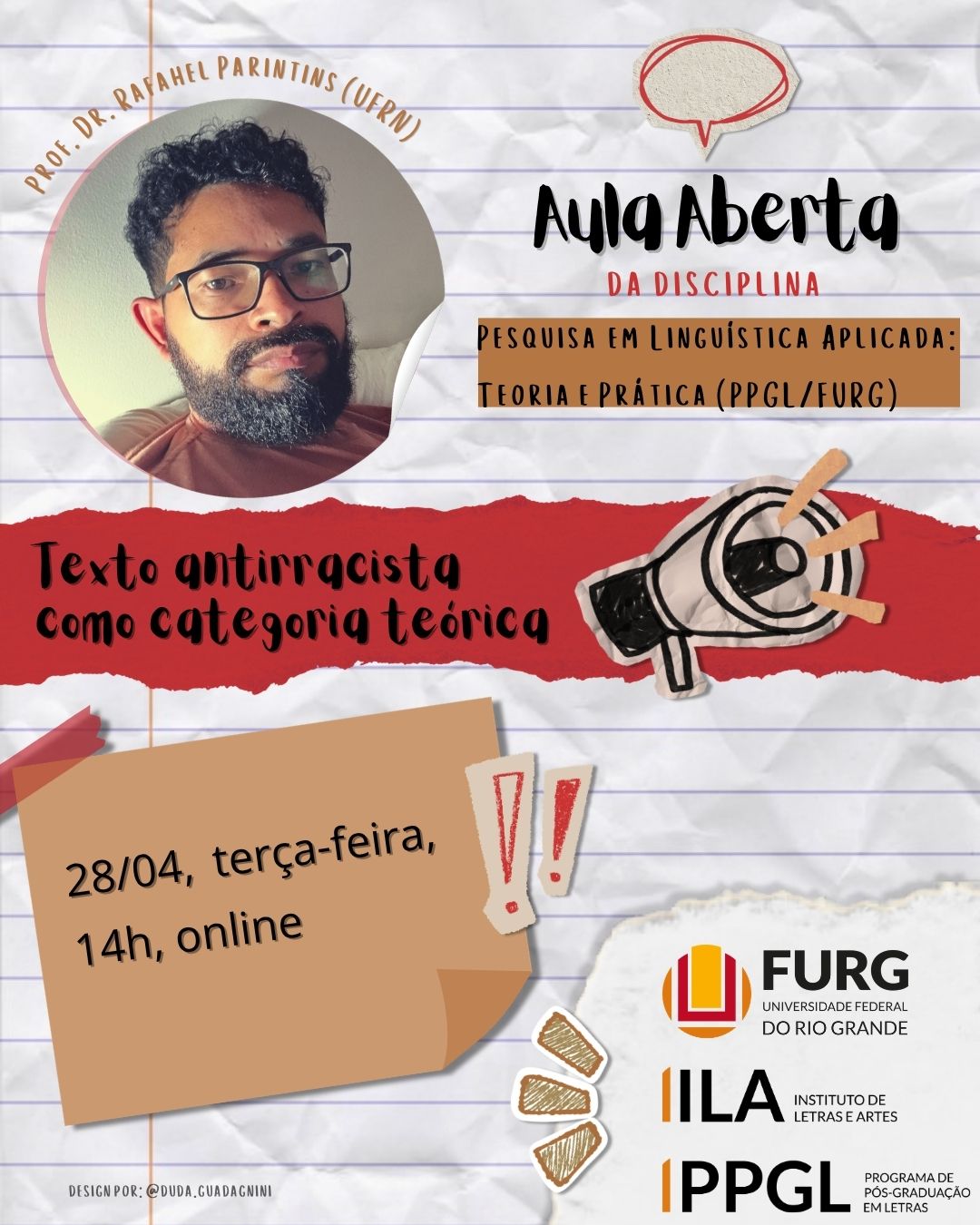 Aula Aberta do PPGL/FURG - Texto antirracista como categoria teóricaOlá, pessoal. Tudo bem? A turma de Pesquisa em Linguística Aplicada: Teoria e Prática, do Programa de Pós-Graduação em Letras (PPGL/FURG), convida a todos/as para a Aula Aberta intitulada Texto antirracista como categoria teórica. Convidado: Prof. Dr. Rafahel Parintins (UFRN). O encontro será no dia 28/04, terça-feira, às 14h, online.