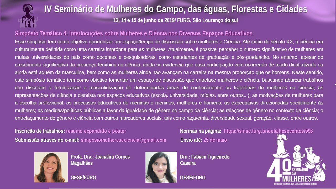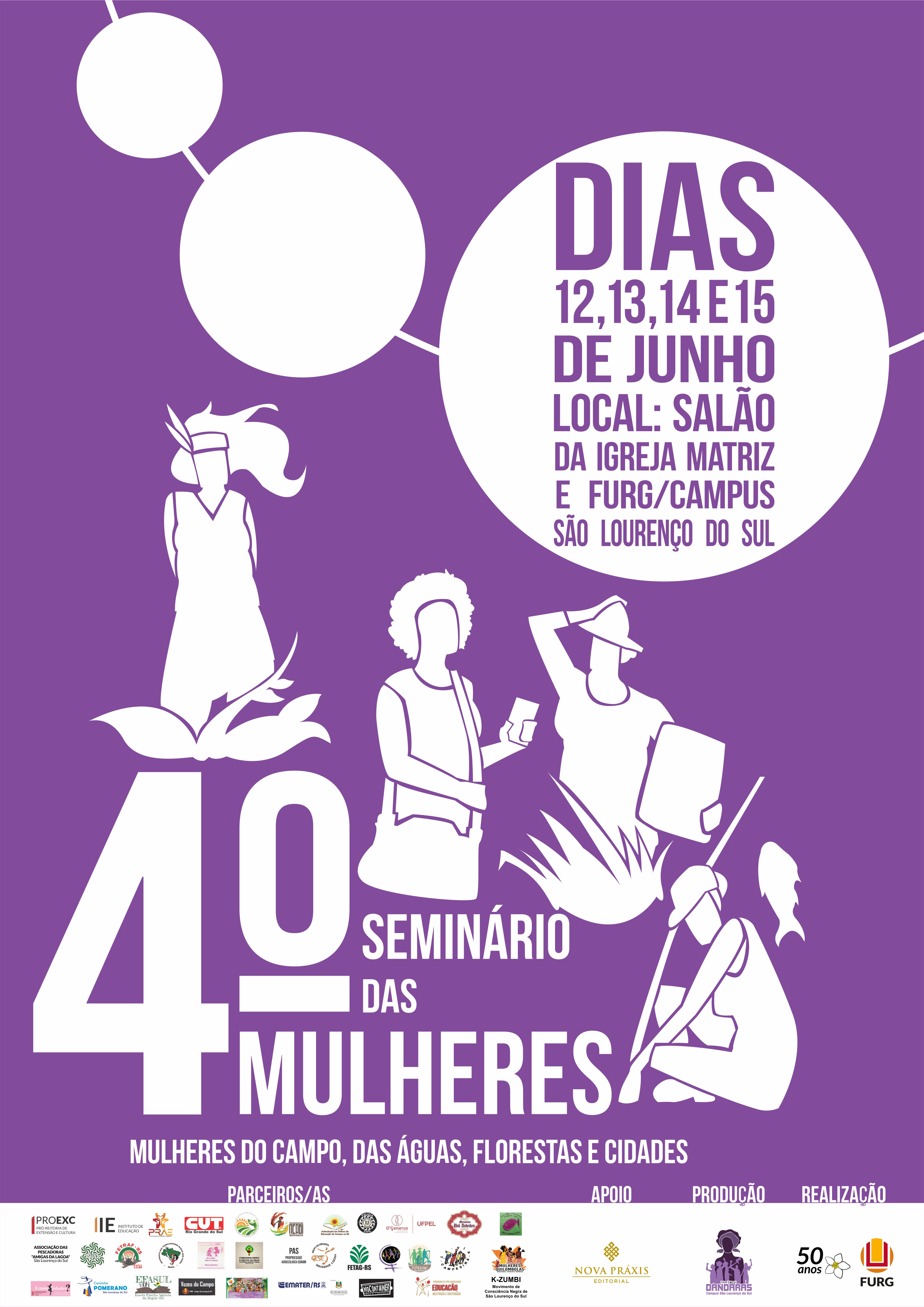 IV Seminário das Mulheres do Campo, das Águas, Florestas e CidadesIV SEMINÁRIO DAS MULHERES DO CAMPO, DAS ÁGUAS, FLORESTAS E CIDADES 12, 13, 14 E 15 DE JUNHO DE 2019 O IV Seminário das Mulheres do Campo, das Águas, Florestas e Cidades acontecerá nos dias 12, 13, 14 e 15 de Junho de 2019 em São Lourenço do Sul. A participação das mulheres em movimentos sociais, tanto no campo como na cidade tem sido intensificado nos últimos anos. Nós do Coletivo Feminista Dandaras, da Universidade Federal do Rio Grande, Campus São Lourenço do Sul estamos atuando desde 2014. Buscamos contribuir na luta dos Direitos Humanos das Mulheres, fortalecendo suas lutas, além de atuar na Universidade, estamos nas escolas, nas ruas, rádio, praia, praça do Município de São Lourenço do Sul e região. O IV Seminário é mais um momento com as mulheres dos povos tradicionais, as pomeranas, agricultoras familiares, quilombolas, indígenas, ciganas, ribeirinhas, pescadoras, benzedeiras, mulheres de terreiro, pecuaristas, e outras. Um seminário que valoriza a diversidade local, proporcionando significativas socializações de vivências e saberes entre as mulheres. Acreditamos que o diálogo entre as mulheres do campo, das águas, florestas e das cidades pode fortalecer os grupos de mulheres, as mulheres sindicalizadas e cooperadas, fortalecendo a auto-organização das mulheres. Sabemos que precisamos estabelecer espaços de diálogos entre professores/as, estudantes e comunidade acadêmica e comunidade em geral sobre a situação das mulheres, os problemas que enfrentam e os desafios que temos frente as políticas públicas e os direitos das mulheres. Nesse sentido, queremos construir um seminário que contribua para o enfrentamento e denuncie diferentes violências, desigualdades de gênero e etnico-raciais.